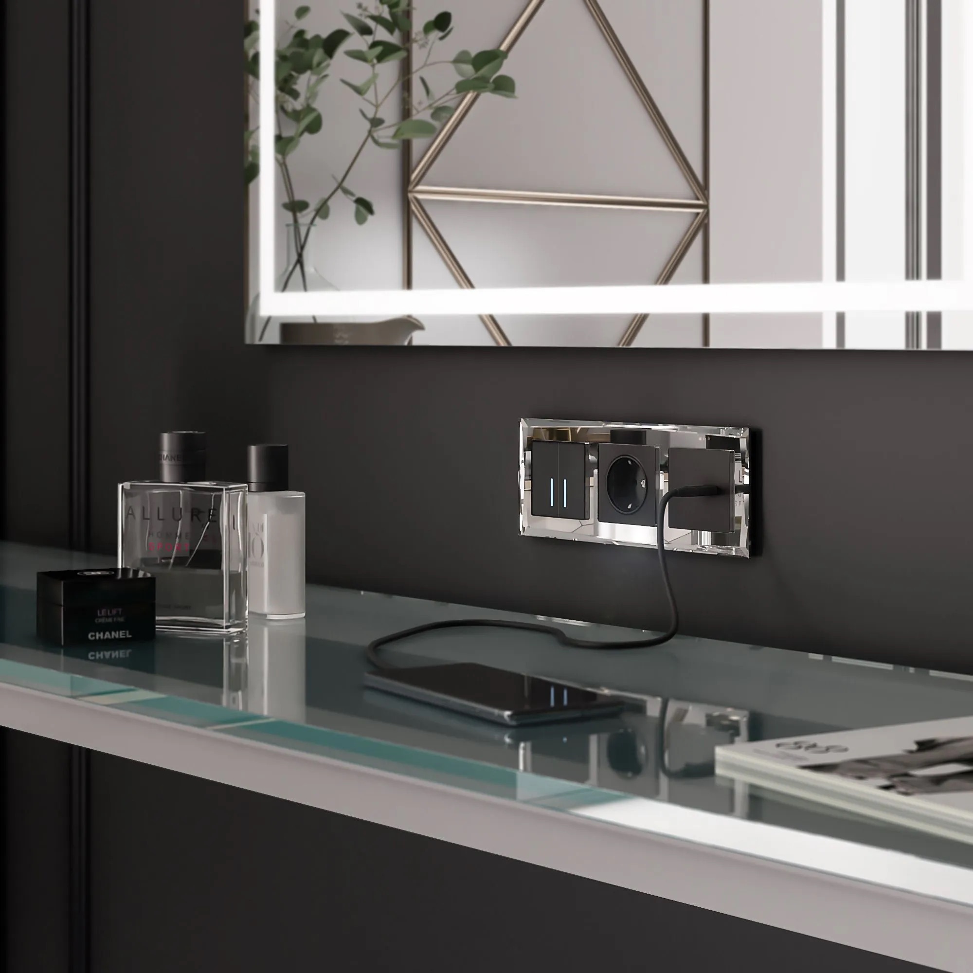 💡 Совет: Выберите чёрный/латунь Baguette для выключателей у входа — это создаст эффектный акцент при включении света.