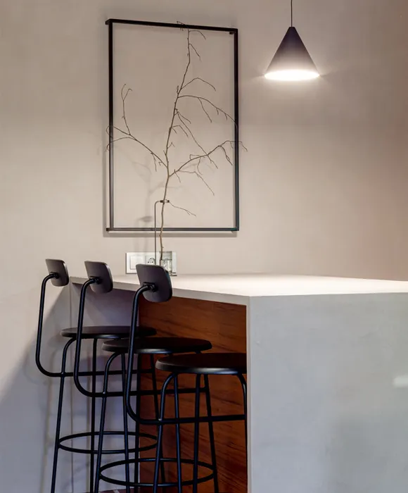 Особое внимание уделили электроустановочным изделиям. В проекте использовались розетки и выключатели торговой марки Werkel™, обрамленные строгими металлическими рамками из серии Aluminium. Эффектная шлифованная поверхность рамок гармонично сочетается с механизмами в серебряном цвете, подчеркивая минималистичный характер интерьера. Такие детали стали важным элементом общего дизайна, добавляя ему завершенности и современности.