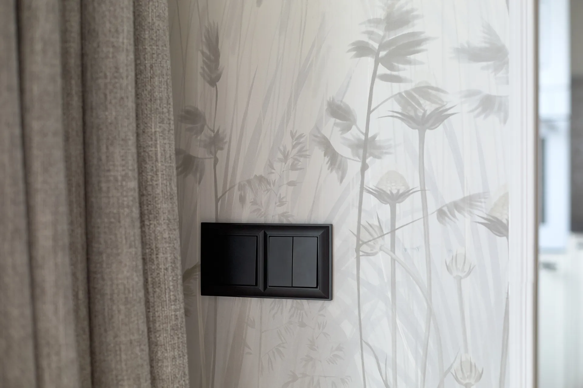 Особое внимание привлекли рамки серии Fiore, дополненные розетками и выключателями торговой марки Werkel™. Их форма повторяет линии кухонной «короны», создавая гармоничный ансамбль с интерьером. Черные рамки и механизмы стали ярким акцентом, который пришелся как нельзя кстати, добавляя пространству современный шарм и завершенность.